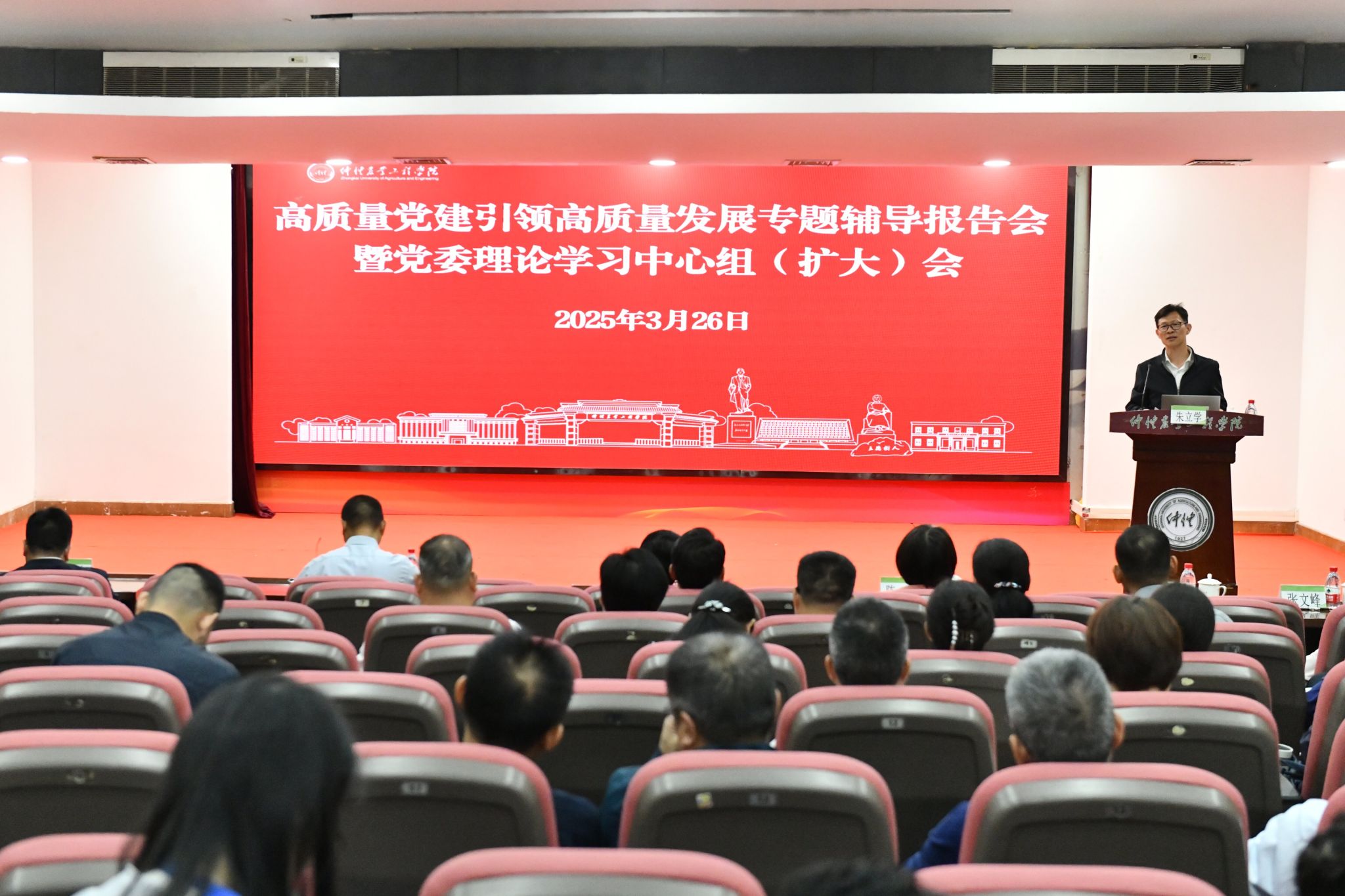 朱立学指出,陈莹副书记的报告政治站位高、理论功底深、联系实际紧,视野开阔、内涵丰富、深入浅出,既是一次精准的辅导,又是一堂生动的党课,对学校各级党组织进一步理清工作思路、扎实做好各项工作具有重要的指导意义。他提出三点工作意见:一是在“双抓双促”上下功夫,落实强基工程行动。各级党组织要以“抓党建、抓队伍,促育人、促发展”为主题,持续加强学校基层党组织建设,构建更加科学、有效的党建与业务融合工作机制,落实立德树人根本任务,推动学校高质量发展。二是在“品牌创建”上下功夫,提升党建工作质量。持续开展“对标争先”计划,学校66个国家、省、校党建“双创”项目要持续强化党建品牌辐射力度,深化宣传推广,构建“一院一品牌、一支部一特色”工作格局,切实发挥示范引领作用。三是在“党建赋能”上下功夫,激发党组织作用发挥。全力推进基层党组织赋能工程,巩固基层党支部战斗堡垒作用,持之以恒锤炼党性,坚持不懈改进作风,引领师生在“更名”“申博”、本科教育教学审核评估、迎接百年校庆、服务“百千万工程”等工作中主动担当作为,为推进特色鲜明的高水平应用型大学建设提供坚强组织保证。